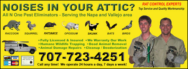 CAT problem, please click on: Sonoma County or Solano County Animal Services Our company is All N One Pest Eliminators and we operate a professional wildlife removal company based out of Napa, California. Examples of common jobs that we do include the removal of squirrels in attics, complete rat removal and prevention, removal of bats from buildings, bird prevention, raccoon trapping, snake removal, and more. We remove dead animals from homes, repair wildlife damage, and clean up wildlife waste and attics. ![]() All N One Pest Eliminators is licensed and insured in the state of California. We service both residential and commercial projects throughout Napa. Give us a call any time at 707-723-4251 and we will listen to you describe your wildlife problem, and schedule an appointment to solve your animal problem. We primarily service the greater Napa area, but will travel further for many types of jobs. This is our primary service range: SOLANO COUNTY: Vallejo, Vacaville, Fairfield NAPA COUNTY: Napa, St. Helena ![]() This Month's Advice: How to Get Wild Animals Out Of a Wall